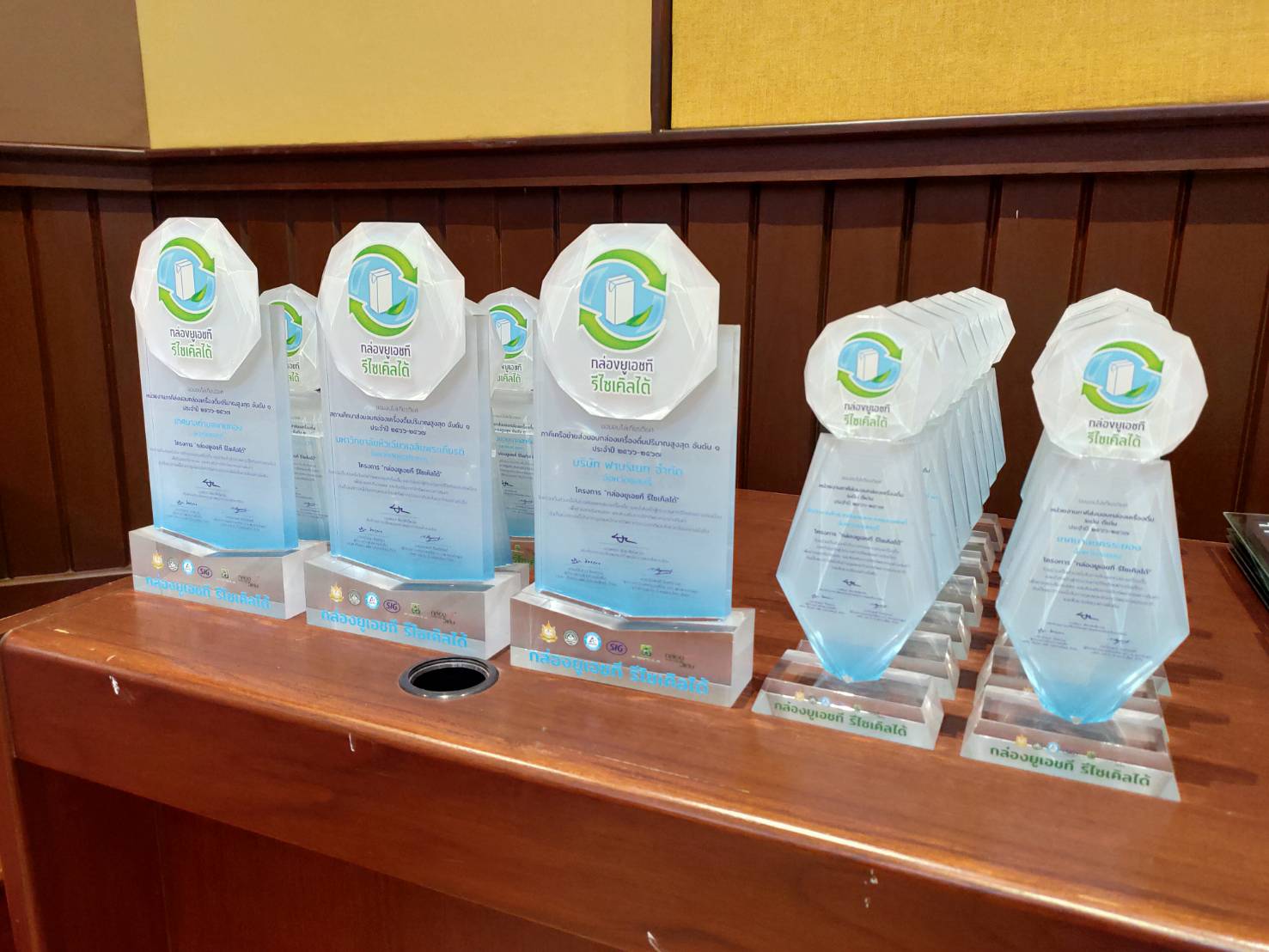 โดยนางสาวกาญจนา ตรีรัตน์ รักษาการผู้อำนวยการกองกลาง เป็นตัวแทนมหาวิทยาลัยเข้ารับรางวัลในฐานะภาคีเครือข่ายที่มีบทบาทสำคัญในการนำกล่องยูเอชทีใช้แล้วกลับเข้าสู่กระบวนการรีไซเคิล เพื่อเปลี่ยนเป็นกระดาษรีไซเคิลคุณภาพสูง สำหรับนำไปผลิตเป็นสื่อการศึกษาและอุปกรณ์สำหรับนักเรียนตาบอดทั่วประเทศ