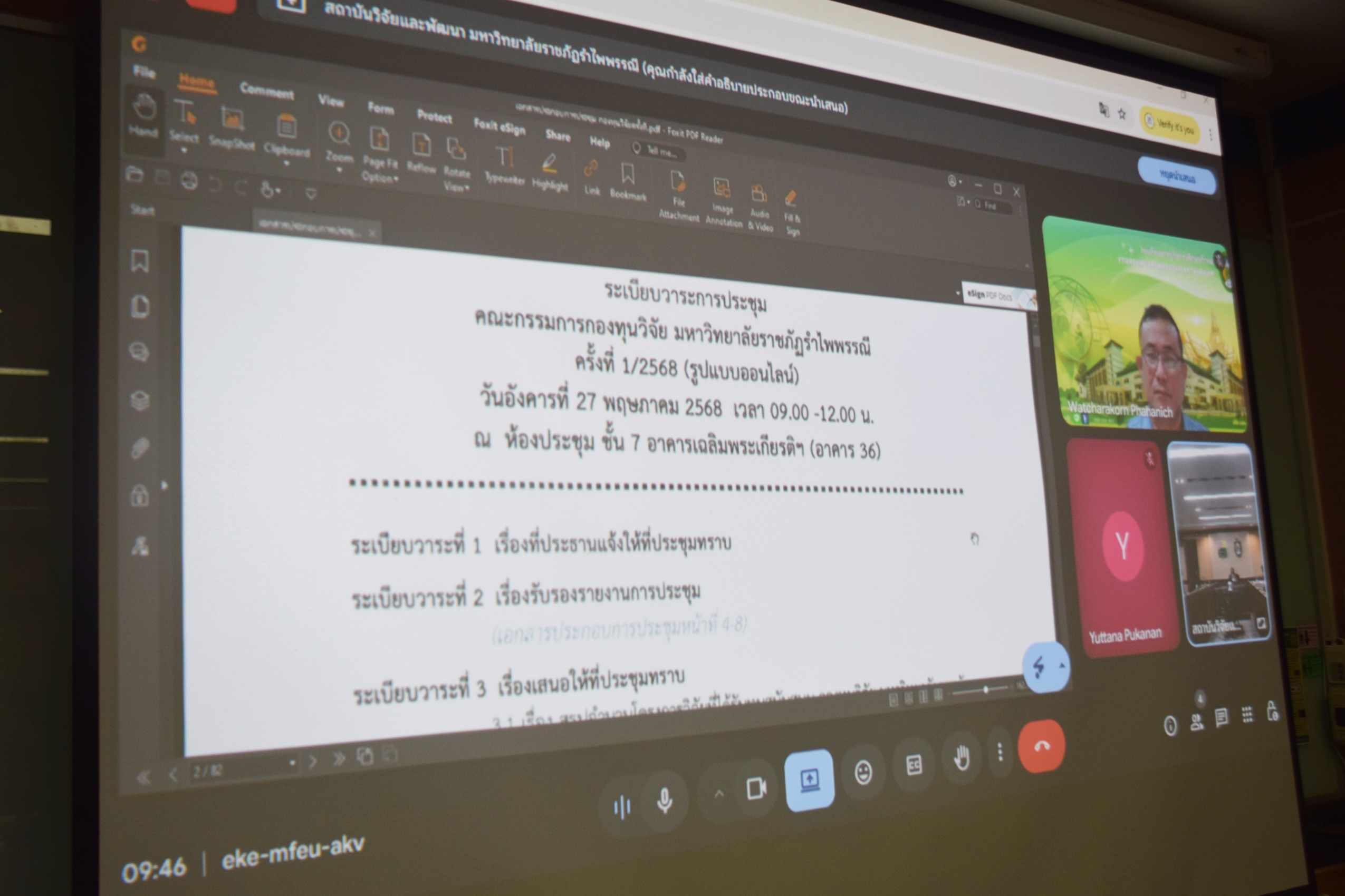 สถาบันวิจัยและพัฒนา มหาวิทยาลัยราชภัฏรำไพพรรณี ดำเนินการประชุมคณะกรรมการกองทุนวิจัย มหาวิทยาลัยราชภัฏรำไพพรรณี ครั้งที่ 1/2568 ทั้งรูปแบบ On-site และ Online ในวันที่ 27 พฤษภาคม 2568 เวลา 09.30 น.ณ ห้องประชุม ชั้น 7 อาคารเฉลิมพระเกียรติฯ (อาคาร 36) โดยผู้ช่วยศาสตราจารย์ไวกูณฑ์ ทองอร่าม อธิการบดี เป็นประธานในการประชุม พร้อมด้วยคณะกรรมการที่เกี่ยวข้องและกรรมการผู้ทรงคุณวุฒิจากหน่วยงานภายนอกได้แก่ ผู้ช่วยศาสตราจารย์วัชรากร พาหะนิชย์ กรรมการผู้ทรงคุณวุฒิด้านวิทยาศาสตร์ฯ จากมหาวิทยาลัยราชภัฏราชนครินทร์ เข้าร่วมในการประชุมผ่านทาง Online