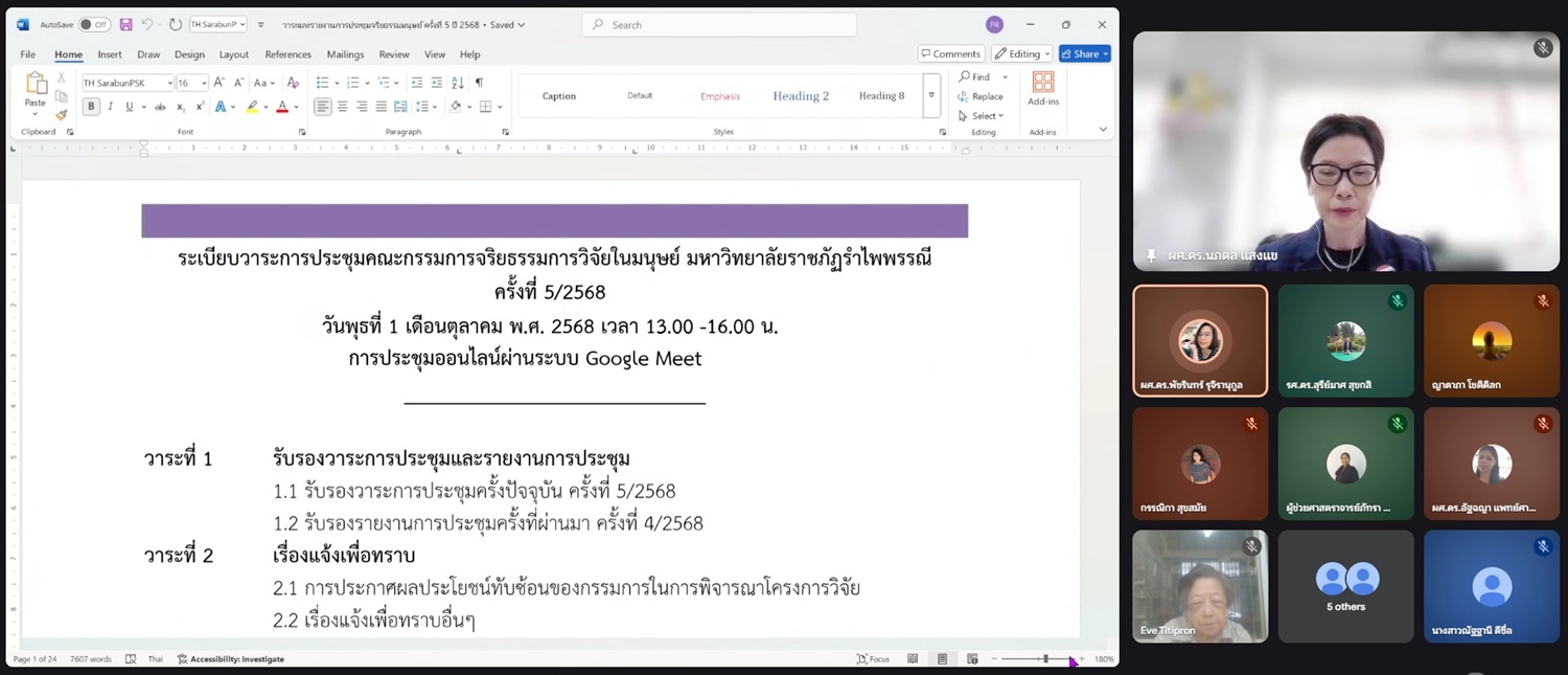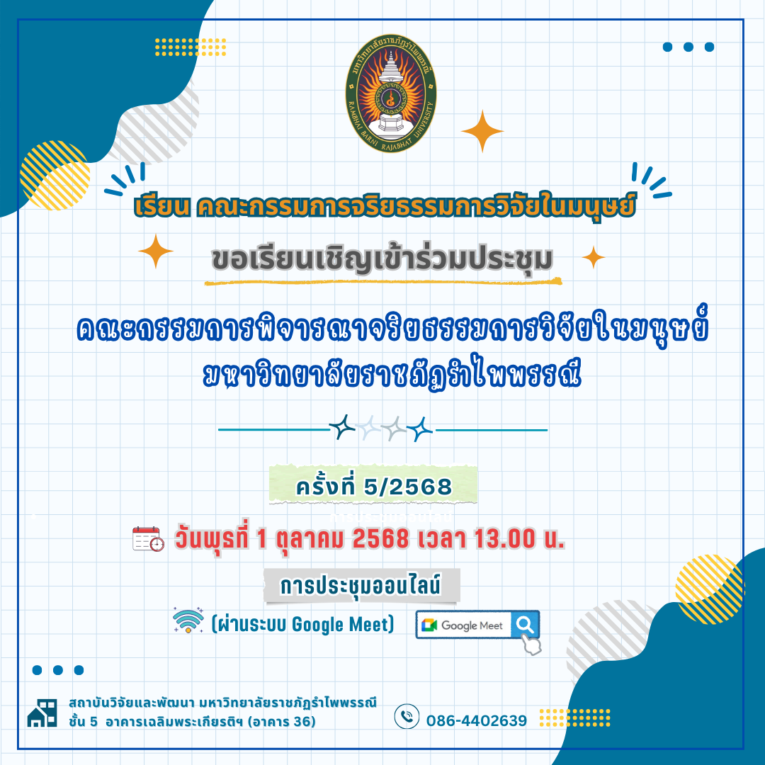 สถาบันวิจัยและพัฒนา มหาวิทยาลัยราชภัฏรำไพพรรณี ดำเนินการประชุมคณะกรรมการพิจารณาจริยธรรมการวิจัยในมนุษย์ มหาวิทยาลัยราชภัฏรำไพพรรณี ครั้งที่ 5/2568 ในวันที่ 1 ตุลาคม 2568 เวลา 13.00 น. ในรูปแบบออนไลน์ผ่านระบบ Google Meet โดยผู้ช่วยศาสตราจารย์ ดร.นภดล แสงแข เป็นประธานในการประชุม พร้อมด้วยคณะกรรมการจากหน่วยงานภายในและภายนอกมหาวิทยาลัย เข้าร่วมในการประชุมครั้งนี้ โดยวัตถุประสงค์ของการประชุมเพื่อพิจารณาโครงการวิจัยที่เสนอขอรับการพิจารณาให้การรับรองจริยธรรมการวิจัยในมนุษย์ โดยคณะกรรมการจะพิจารณาถึงความเหมาะสมและความเป็นไปได้ในการดำเนินงาน และเพื่อการพิทักษ์สิทธิ์ของกลุ่มตัวอย่างที่เกี่ยวข้องในการดำเนินการวิจัย