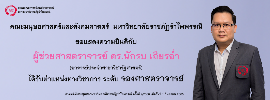 คณะมนุษยศาสตร์และสังคมศาสตร์ มหาวิทยาลัยราชภัฏรำไพพรรณี ขอแสดงความยินดีกับ ผู้ช่วยศาสตราจารย์ ดร.นักรบ เถียรอ่ำ ได้รับตำแหน่งทางวิชาการ ระดับ รองศาสตราจารย์ ตามมติที่ประชุมสภามหาวิทยาลัยราชภัฏรำไพพรรณี ครั้งที่ 9/2568 เมื่อวันที่ 1 กันยายน 2568
