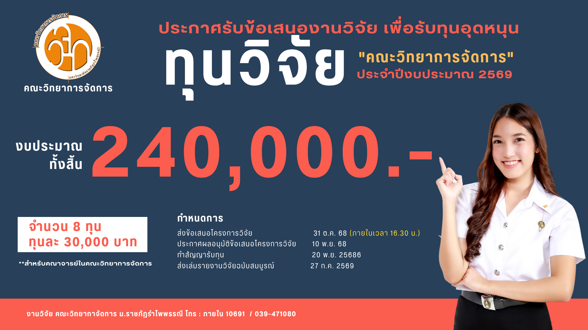 FMSRBRU : ประกาศรับข้อเสนอโครงร่างงานวิจัย ทุนคณะวิทยาการจัดการประจำปีงบประมาณ 2569 จำนวน 8 ทุน