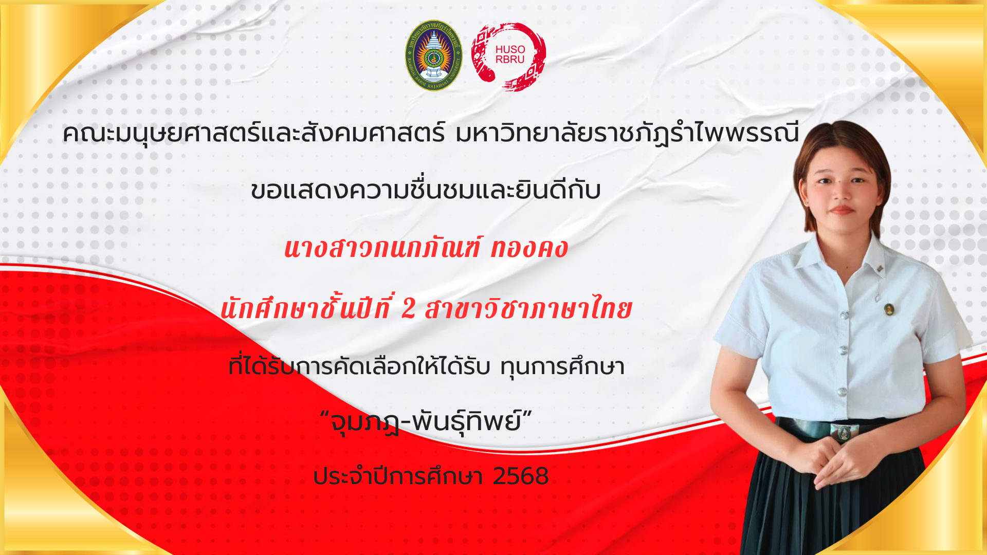 คณะมนุษยศาสตร์และสังคมศาสตร์ มหาวิทยาลัยราชภัฏรำไพพรรณี ขอแสดงความชื่นชมและยินดีกับ นางสาวกนกภัณฑ์ ทองคง นักศึกษาชั้นปีที่ 2 สาขาวิชาภาษาไทย ที่ได้รับการคัดเลือกให้ได้รับ ทุนการศึกษา “จุมภฏ-พันธุ์ทิพย์” ประจำปีการศึกษา 2568