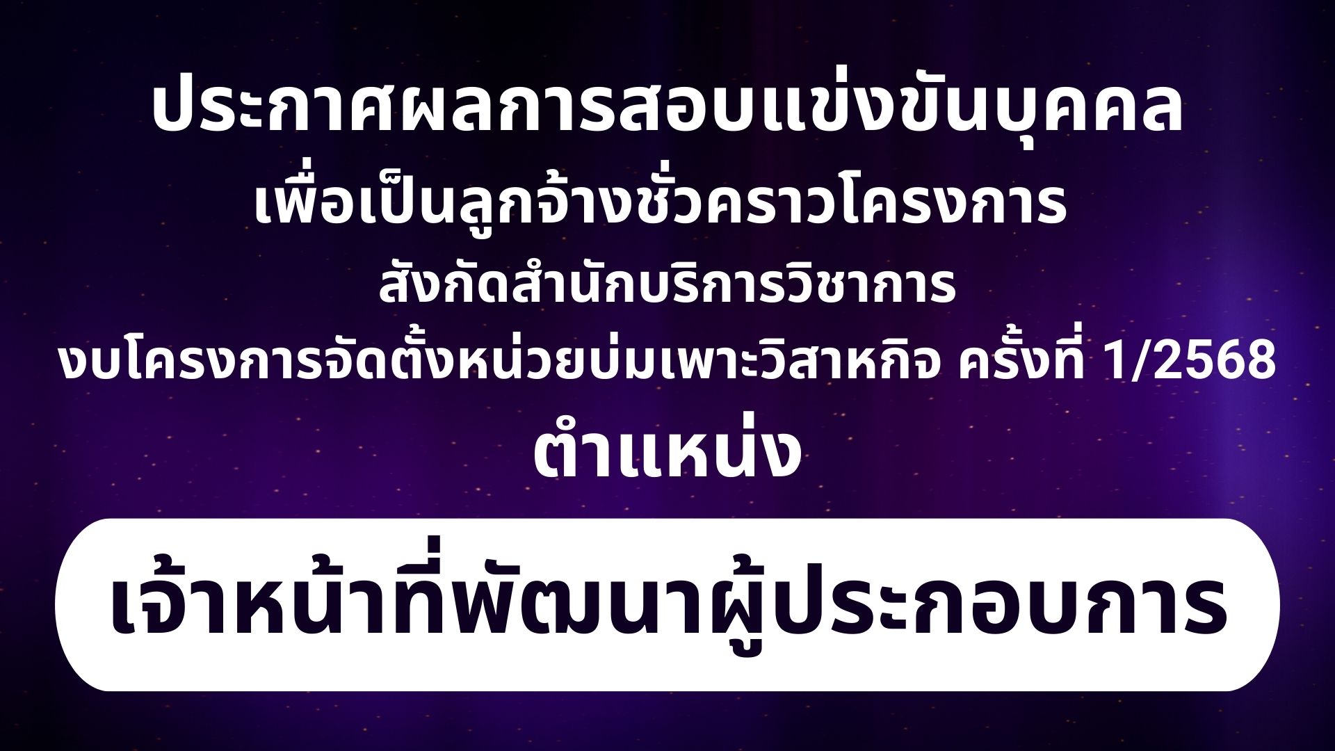 ประกาศมหาวิทยาลัยราชภัฏรำไพพรรณี เรื่อง ผลการสอบแข่งขันบุคคลเพื่อเป็นลูกจ้างชั่วคราวโครงการ สังกัดสำนักบริการวิชาการ งบโครงการจัดตั้งหน่วยบ่มเพาะวิสาหกิจ ครั้งที่ 1/2568 ตำแหน่งเจ้าหน้าที่พัฒนาผู้ประกอบการ