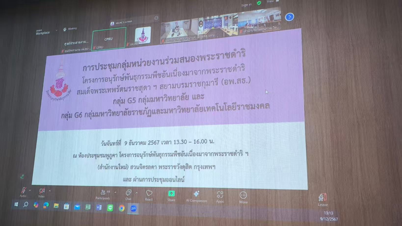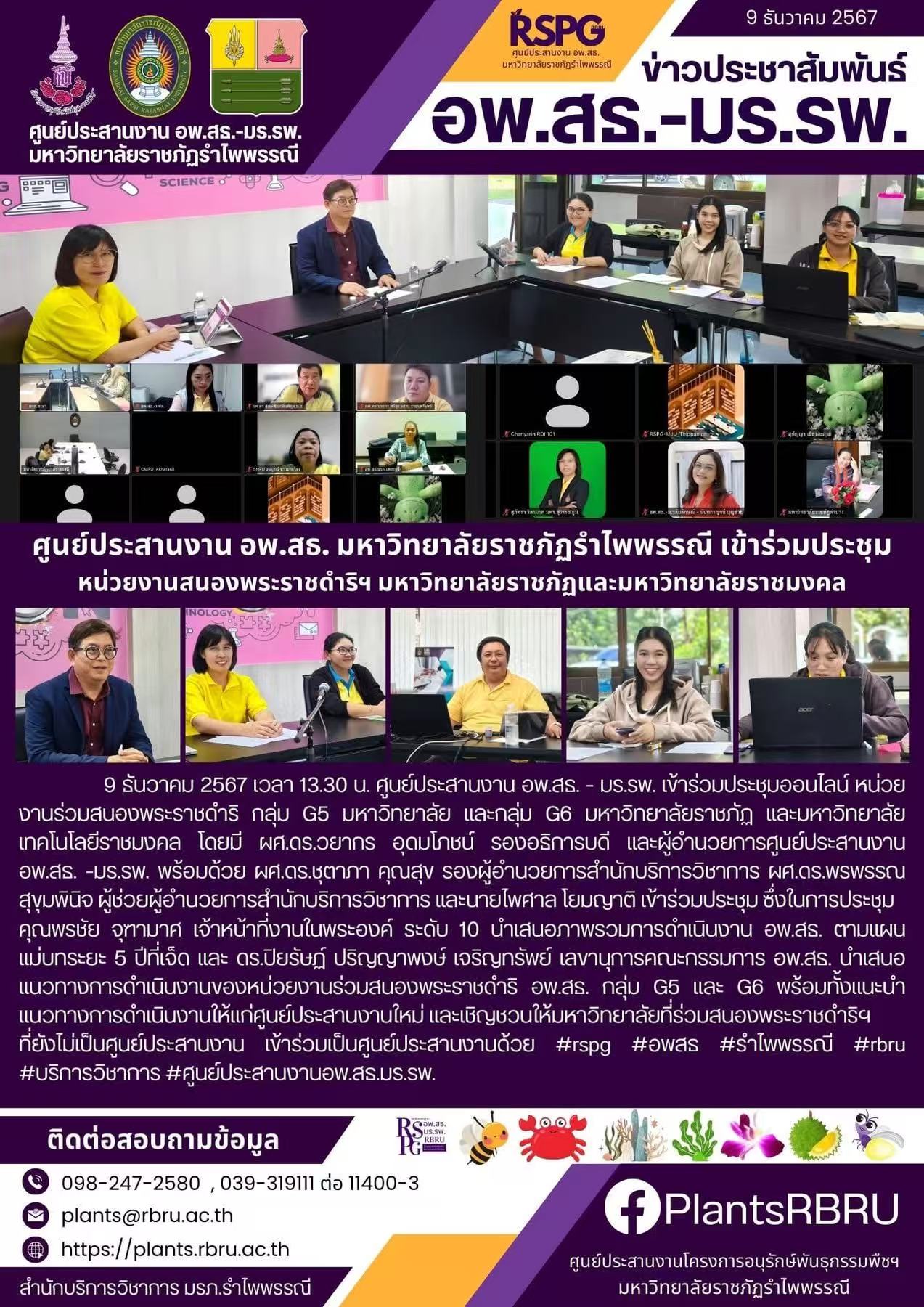 9 ธันวาคม 2567 เวลา 13.30 น. ศูนย์ประสานงาน อพ.สธ. - มร.รพ. เข้าร่วมประชุมออนไลน์ หน่วยงานร่วมสนองพระราชดำริ กลุ่ม G5 มหาวิทยาลัย และกลุ่ม G6 มหาวิทยาลัยราชภัฏ และมหาวิทยาลัยเทคโนโลยีราชมงคล โดยมี ผศ.ดร.วยากร อุดมโภชน์ รองอธิการบดี และผู้อำนวยการศูนย์ประสานงาน อพ.สธ. -มร.รพ. พร้อมด้วย ผศ.ดร.ชุตาภา คุณสุข รองผู้อำนวยการสำนักบริการวิชาการ ผศ.ดร.พรพรรณ สุขุมพินิจ ผู้ช่วยผู้อำนวยการสำนักบริการวิชาการ และนายไพศาล โยมญาติ เข้าร่วมประชุม ซึ่งในการประชุม คุุณพรชัย จุฑามาศ เจ้าหน้าที่งานในพระองค์ ระดับ 10 นำเสนอภาพรวมการดำเนินงาน อพ.สธ. ตามแผนแม่บทระยะ 5 ปีที่เจ็ด และ ดร.ปิยรัษฏ์ ปริญญาพงษ์ เจริญทรัพย์ เลขานุการคณะกรรมการ อพ.สธ. นำเสนอ แนวทางการดำเนินงานของหน่วยงานร่วมสนองพระราชดำริ อพ.สธ. กลุ่ม G5 และ G6 พร้อมทั้งแนะนำแนวทางการดำเนินงานให้แก่ศูนย์ประสานงานใหม่ และเชิญชวนให้มหาวิทยาลัยที่ร่วมสนองพระราชดำริฯ ที่ยังไม่เป็นศูนย์ประสานงาน เข้าร่วมเป็นศูนย์ประสานงานด้วย #rspg #อพสธ #รำไพพรรณี #rbru #บริการวิชาการ #ศูนย์ประสานงานอพ.สธ.มร.รพ.