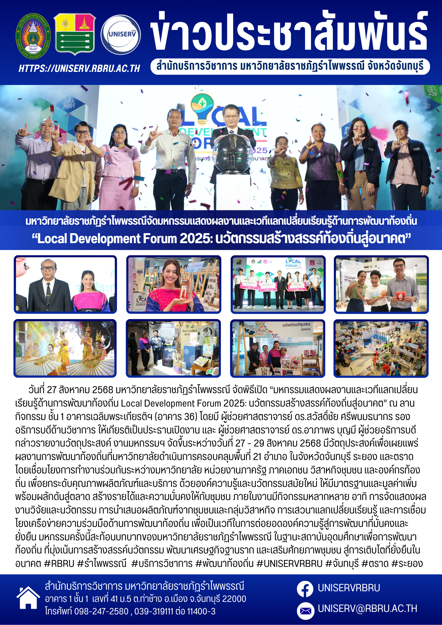 วันที่ 27 สิงหาคม 2568 มหาวิทยาลัยราชภัฏรำไพพรรณี จัดพิธีเปิด “มหกรรมแสดงผลงานและเวทีแลกเปลี่ยนเรียนรู้ด้านการพัฒนาท้องถิ่น Local Development Forum 2025: นวัตกรรมสร้างสรรค์ท้องถิ่นสู่อนาคต” ณ ลานกิจกรรม ชั้น 1 อาคารเฉลิมพระเกียรติฯ (อาคาร 36) โดยมี ผู้ช่วยศาสตราจารย์ ดร.สวัสดิ์ชัย ศรีพนมธนากร รองอธิการบดีด้านวิชาการ ให้เกียรติเป็นประธานเปิดงาน และ ผู้ช่วยศาสตราจารย์ ดร.อาภาพร บุญมี ผู้ช่วยอธิการบดี กล่าวรายงานวัตถุประสงค์ งานมหกรรมฯ จัดขึ้นระหว่างวันที่ 27 – 29 สิงหาคม 2568 มีวัตถุประสงค์เพื่อเผยแพร่ผลงานการพัฒนาท้องถิ่นที่มหาวิทยาลัยดำเนินการครอบคลุมพื้นที่ 21 อำเภอ ในจังหวัดจันทบุรี ระยอง และตราด โดยเชื่อมโยงการทำงานร่วมกันระหว่างมหาวิทยาลัย หน่วยงานภาครัฐ ภาคเอกชน วิสาหกิจชุมชน และองค์กรท้องถิ่น เพื่อยกระดับคุณภาพผลิตภัณฑ์และบริการ ด้วยองค์ความรู้และนวัตกรรมสมัยใหม่ ให้มีมาตรฐานและมูลค่าเพิ่ม พร้อมผลักดันสู่ตลาด สร้างรายได้และความมั่นคงให้กับชุมชน ภายในงานมีกิจกรรมหลากหลาย อาทิ การจัดแสดงผลงานวิจัยและนวัตกรรม การนำเสนอผลิตภัณฑ์จากชุมชนและกลุ่มวิสาหกิจ การเสวนาแลกเปลี่ยนเรียนรู้ และการเชื่อมโยงเครือข่ายความร่วมมือด้านการพัฒนาท้องถิ่น เพื่อเป็นเวทีในการต่อยอดองค์ความรู้สู่การพัฒนาที่มั่นคงและยั่งยืน มหกรรมครั้งนี้สะท้อนบทบาทของมหาวิทยาลัยราชภัฏรำไพพรรณี ในฐานะสถาบันอุดมศึกษาเพื่อการพัฒนาท้องถิ่น ที่มุ่งเน้นการสร้างสรรค์นวัตกรรม พัฒนาเศรษฐกิจฐานราก และเสริมศักยภาพชุมชน สู่การเติบโตที่ยั่งยืนในอนาคต #RBRU #รำไพพรรณี #บริการวิชาการ #พัฒนาท้องถิ่น #UNISERVRBRU #จันทบุรี #ตราด #ระยอง