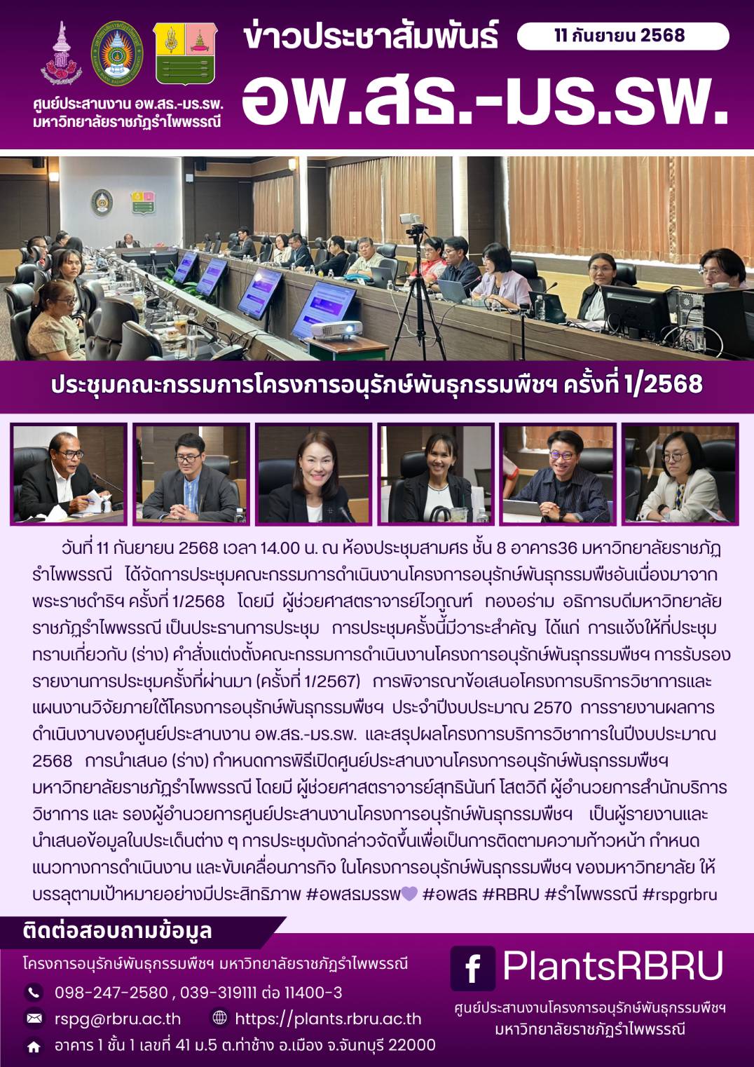 วันที่ 11 กันยายน 2568 เวลา 14.00 น. ณ ห้องประชุมสามศร ชั้น 8 อาคาร36 มหาวิทยาลัยราชภัฏรำไพพรรณี ได้จัดการประชุมคณะกรรมการดำเนินงานโครงการอนุรักษ์พันธุกรรมพืชอันเนื่องมาจากพระราชดำริฯ ครั้งที่ 1/2568 โดยมี ผู้ช่วยศาสตราจารย์ไวกูณฑ์ ทองอร่าม อธิการบดีมหาวิทยาลัยราชภัฏรำไพพรรณี เป็นประธานการประชุม การประชุมครั้งนี้มีวาระสำคัญ ได้แก่ การแจ้งให้ที่ประชุมทราบเกี่ยวกับ (ร่าง) คำสั่งแต่งตั้งคณะกรรมการดำเนินงานโครงการอนุรักษ์พันธุกรรมพืชฯ การรับรองรายงานการประชุมครั้งที่ผ่านมา (ครั้งที่ 1/2567) การพิจารณาข้อเสนอโครงการบริการวิชาการและแผนงานวิจัยภายใต้โครงการอนุรักษ์พันธุกรรมพืชฯ ประจำปีงบประมาณ 2570 การรายงานผลการดำเนินงานของศูนย์ประสานงาน อพ.สธ.-มร.รพ. และสรุปผลโครงการบริการวิชาการในปีงบประมาณ 2568 การนำเสนอ (ร่าง) กำหนดการพิธีเปิดศูนย์ประสานงานโครงการอนุรักษ์พันธุกรรมพืชฯ มหาวิทยาลัยราชภัฏรำไพพรรณี โดยมี ผู้ช่วยศาสตราจารย์สุทธินันท์ โสตวิถี ผู้อำนวยการสำนักบริการวิชาการ และ รองผู้อำนวยการศูนย์ประสานงานโครงการอนุรักษ์พันธุกรรมพืชฯ เป็นผู้รายงานและนำเสนอข้อมูลในประเด็นต่าง ๆ การประชุมดังกล่าวจัดขึ้นเพื่อเป็นการติดตามความก้าวหน้า กำหนดแนวทางการดำเนินงาน และขับเคลื่อนภารกิจ ในโครงการอนุรักษ์พันธุกรรมพืชฯ ของมหาวิทยาลัย ให้บรรลุตามเป้าหมายอย่างมีประสิทธิภาพ #อพสธมรรพ