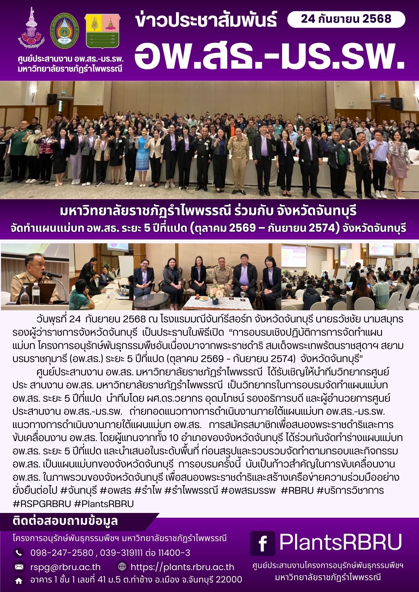 วันที่ 24 กันยายน 2568 ณ โรงแรมมณีจันท์รีสอร์ท จังหวัดจันทบุรี นายธวัชชัย นามสมุทร รองผู้ว่าราชการจังหวัดจันทบุรี เป็นประธานในพิธีเปิด “การอบรมเชิงปฏิบัติการการจัดทำแผนแม่บท โครงการอนุรักษ์พันธุกรรมพืชอันเนื่องมาจากพระราชดำริ สมเด็จพระเทพรัตนราชสุดาฯ สยามบรมราชกุมารี (อพ.สธ.) ระยะ 5 ปีที่แปด (ตุลาคม 2569 – กันยายน 2574) จังหวัดจันทบุรี” โดยศูนย์ประสานงาน อพ.สธ. มหาวิทยาลัยราชภัฏรำไพพรรณี ได้รับเชิญให้นำทีมวิทยากรศูนย์ประสานงาน อพ.สธ. มหาวิทยาลัยราชภัฏรำไพพรรณี ซึ่งนำทีมโดย ผศ.ดร.วยากร อุดมโภชน์ รองอธิการบดี และผู้อำนวยการศูนย์ประสานงาน อพ.สธ.-มร.รพ. ถ่ายทอดแนวทางการดำเนินงานภายใต้แผนแม่บท อพ.สธ.-มร.รพ. แนวทางการดำเนินงานภายใต้แผนแม่บท อพ.สธ. การสมัครสมาชิกเพื่อสนองพระราชดำริและการขับเคลื่อนงาน อพ.สธ. ช่วงบ่าย ผู้แทนจากทั้ง 10 อำเภอของจังหวัดจันทบุรี ได้ร่วมกันจัดทำและนำเสนอร่างแผนแม่บท อพ.สธ. ระยะ 5 ปีที่แปดในระดับพื้นที่ ก่อนสรุปตามกรอบและกิจกรรม อพ.สธ. จังหวัดจันทบุรี โดยมีสำนักงานจังหวัดจันทบุรีและทีมวิทยากรศูนย์ประสานงาน อพ.สธ.-มร.รพ. ร่วมให้ข้อเสนอแนะ การอบรมครั้งนี้ นับเป็นก้าวสำคัญในการขับเคลื่อนงาน อพ.สธ.ในภาพรวมของจังหวัดจันทบุรี เพื่อสนองพระราชดำริและสร้างเครือข่ายความร่วมมืออย่างยั่งยืนต่อไป #จันทบุรี #รำไพพรรณี #อพสธมรรพ #อพสธ #รำไพ #RBRU #บริการวิชาการ #RSPGRBRU #PlantsRBRU