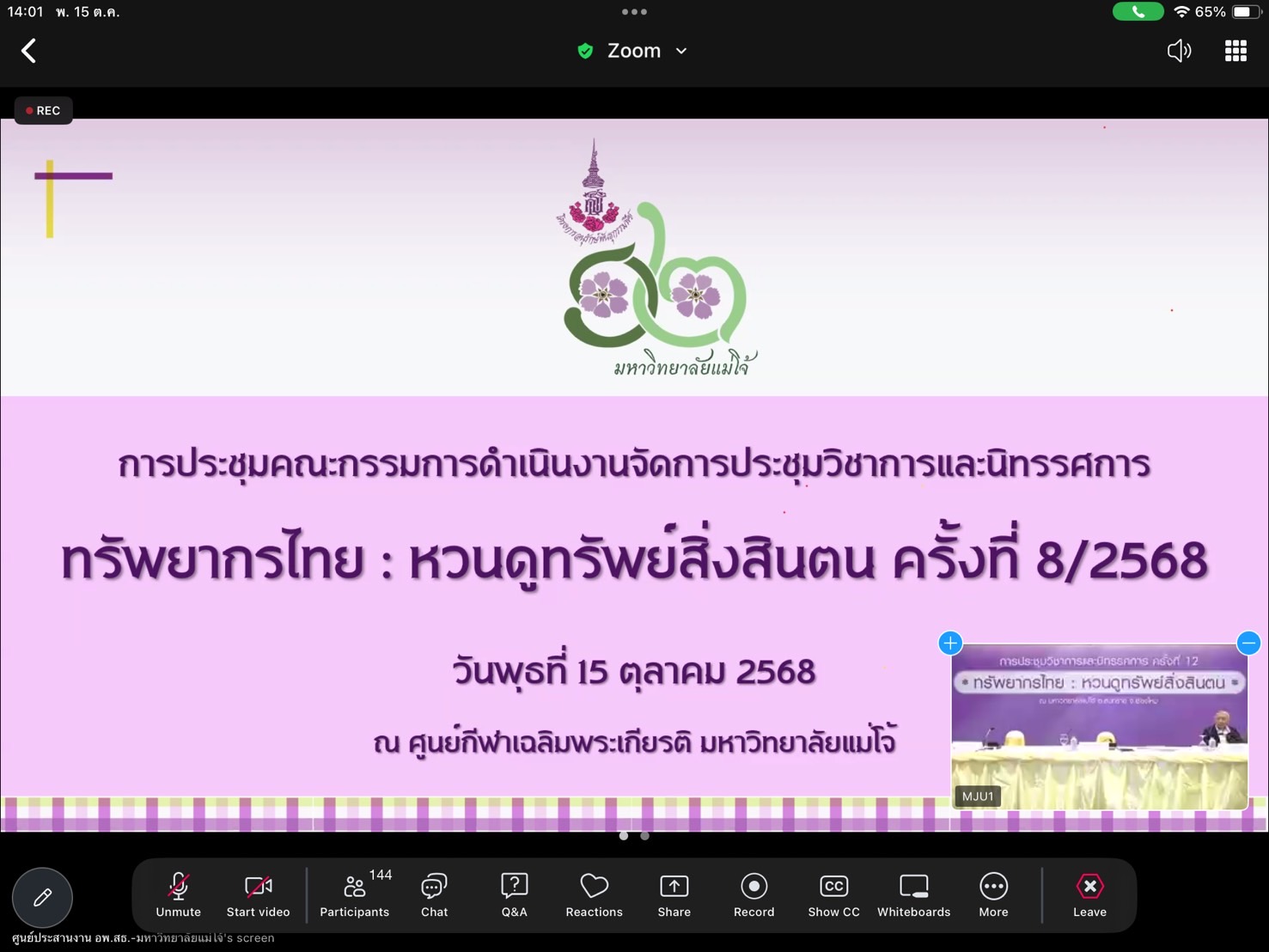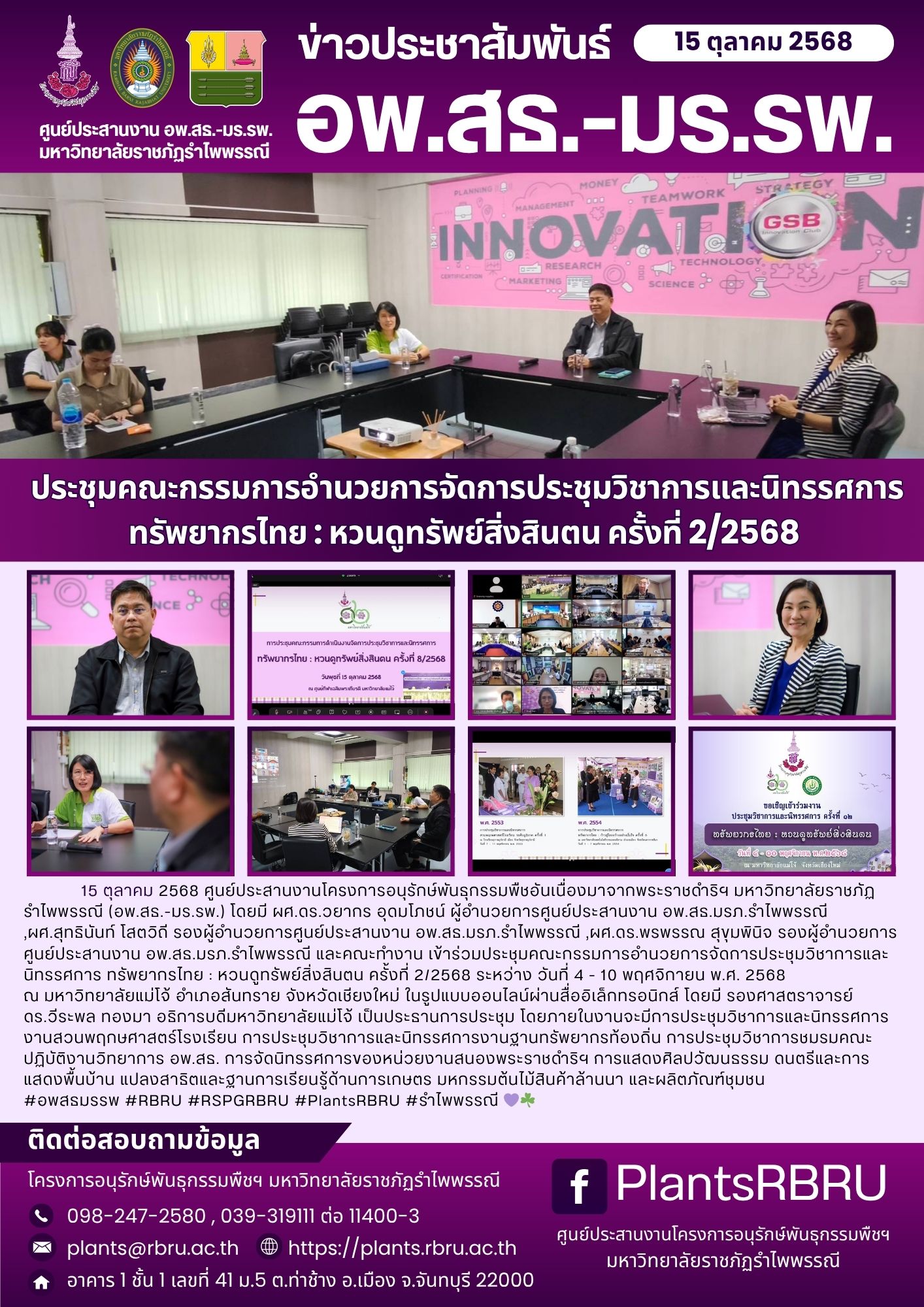 15 ตุลาคม 2568 เวลา 14.00 น. ศูนย์ประสานงานโครงการอนุรักษ์พันธุกรรมพืชอันเนื่องมาจากพระราชดำริฯ มหาวิทยาลัยราชภัฏรำไพพรรณี (อพ.สธ.-มร.รพ.) โดยมี ผศ.ดร.วยากร อุดมโภชน์ รองอธิการบดีและผู้อำนวยการศูนย์ประสานงาน อพ.สธ.-มรภ.รำไพพรรณี ,ผศ.สุทธินันท์ โสตวิถี รองผู้อำนวยการศูนย์ประสานงาน อพ.สธ.-มรภ.รำไพพรรณี ,ผศ.ดร.พรพรรณ สุขุมพินิจ รองผู้อำนวยการศูนย์ประสานงาน อพ.สธ.-มรภ.รำไพพรรณี และคณะทำงาน เข้าร่วมประชุมคณะกรรมการอำนวยการจัดการประชุมวิชาการและนิทรรศการ ทรัพยากรไทย : หวนดูทรัพย์สิ่งสินตน ครั้งที่ 2/2568 ระหว่าง วันที่ 4 - 10 พฤศจิกายน พ.ศ. 2568 ณ มหาวิทยาลัยแม่โจ้ อำเภอสันทราย จังหวัดเชียงใหม่ ในรูปแบบออนไลน์ผ่านสื่ออิเล็กทรอนิกส์ โดยมี รองศาสตราจารย์ ดร.วีระพล ทองมา อธิการบดีมหาวิทยาลัยแม่โจ้ เป็นประธานการประชุม โดยภายในงานจะมีการประชุมวิชาการและนิทรรศการงานสวนพฤกษศาสตร์โรงเรียน การประชุมวิชาการและนิทรรศการงานฐานทรัพยากรท้องถิ่น การประชุมวิชาการชมรมคณะปฏิบัติงานวิทยาการ อพ.สธ. การจัดนิทรรศการของหน่วยงานสนองพระราชดำริฯ การแสดงศิลปวัฒนธรรม ดนตรีและการแสดงพื้นบ้าน แปลงสาธิตและฐานการเรียนรู้ด้านการเกษตร มหกรรมต้นไม้สินค้าล้านนา และผลิตภัณฑ์ชุมชน