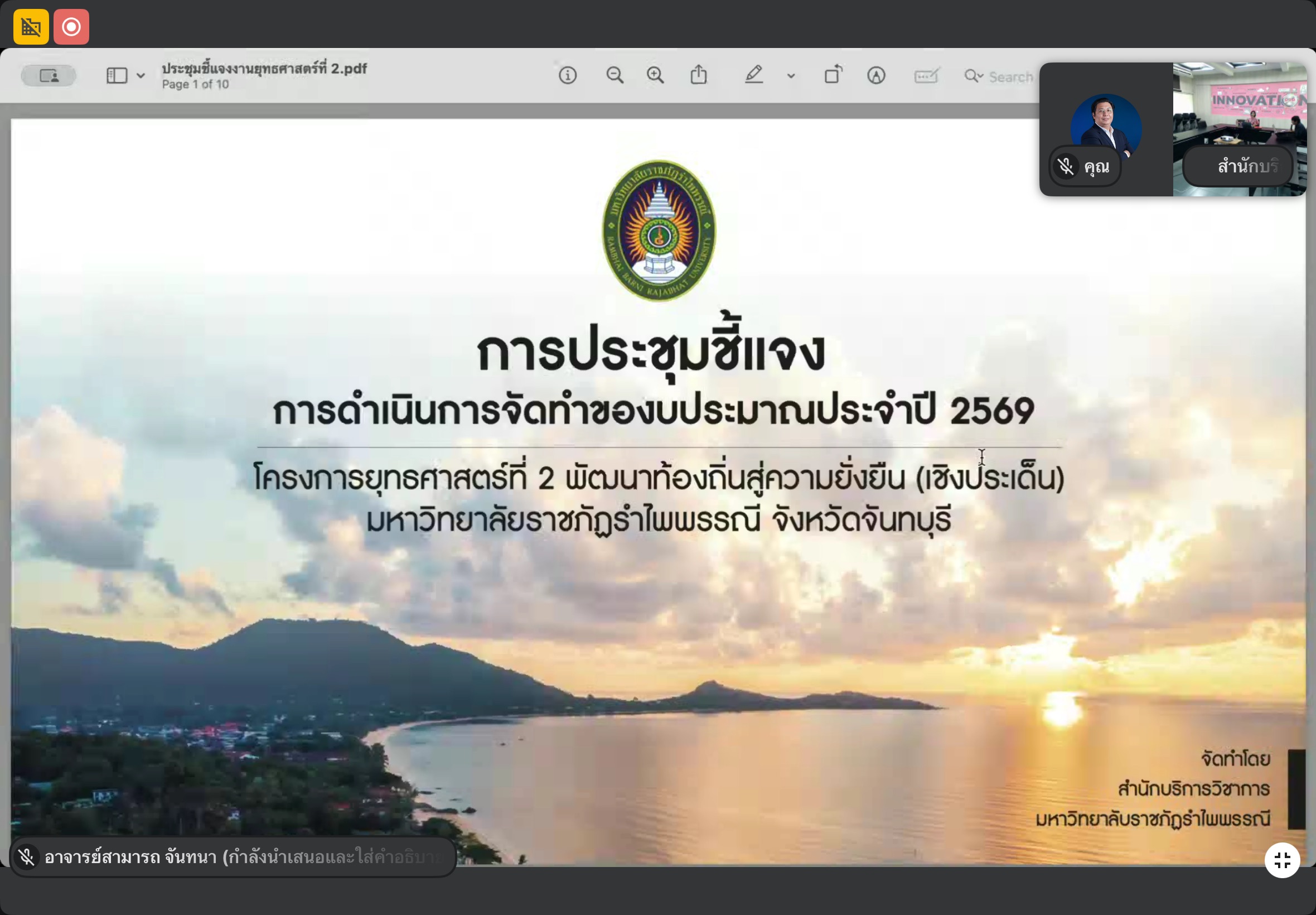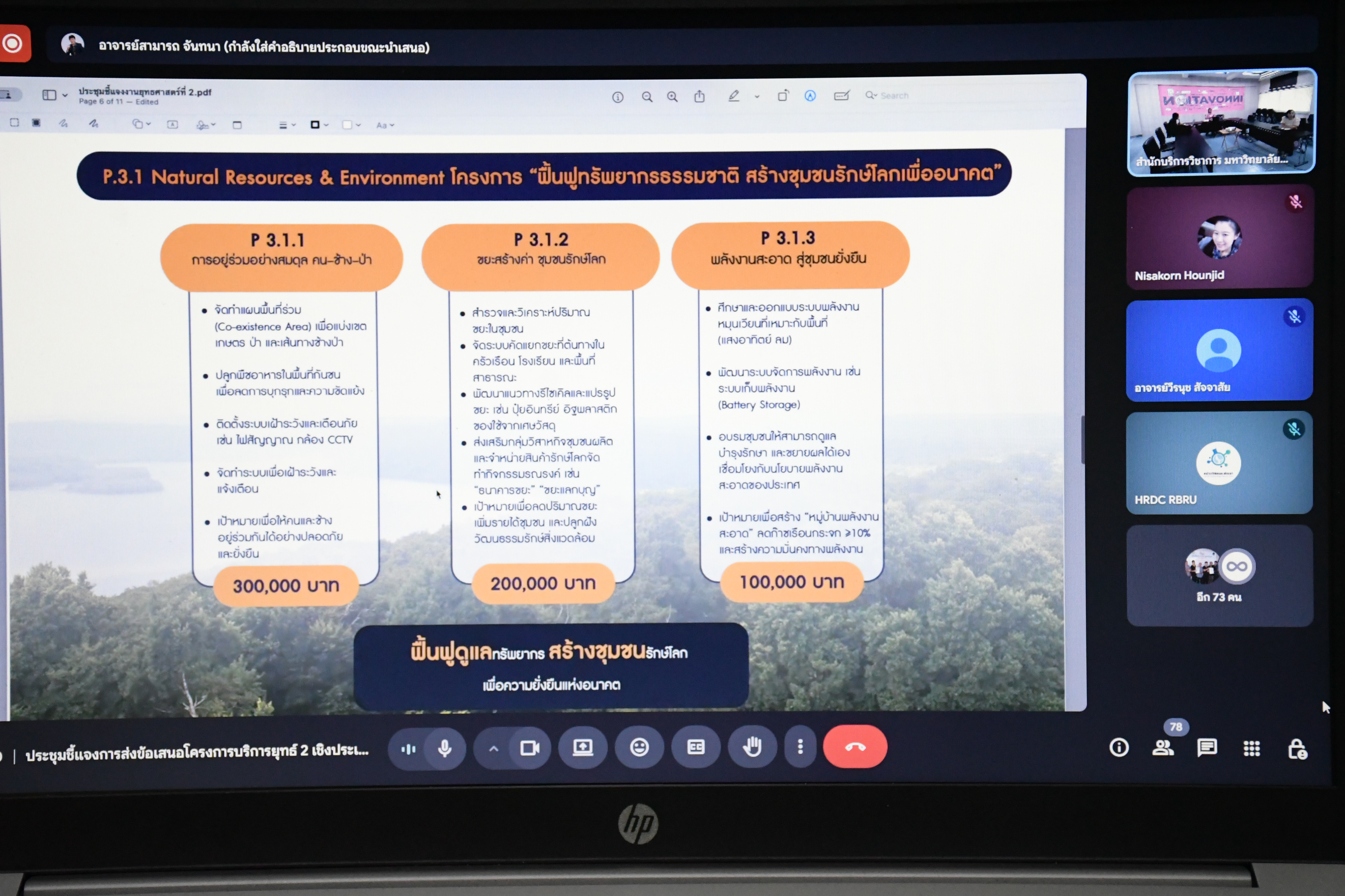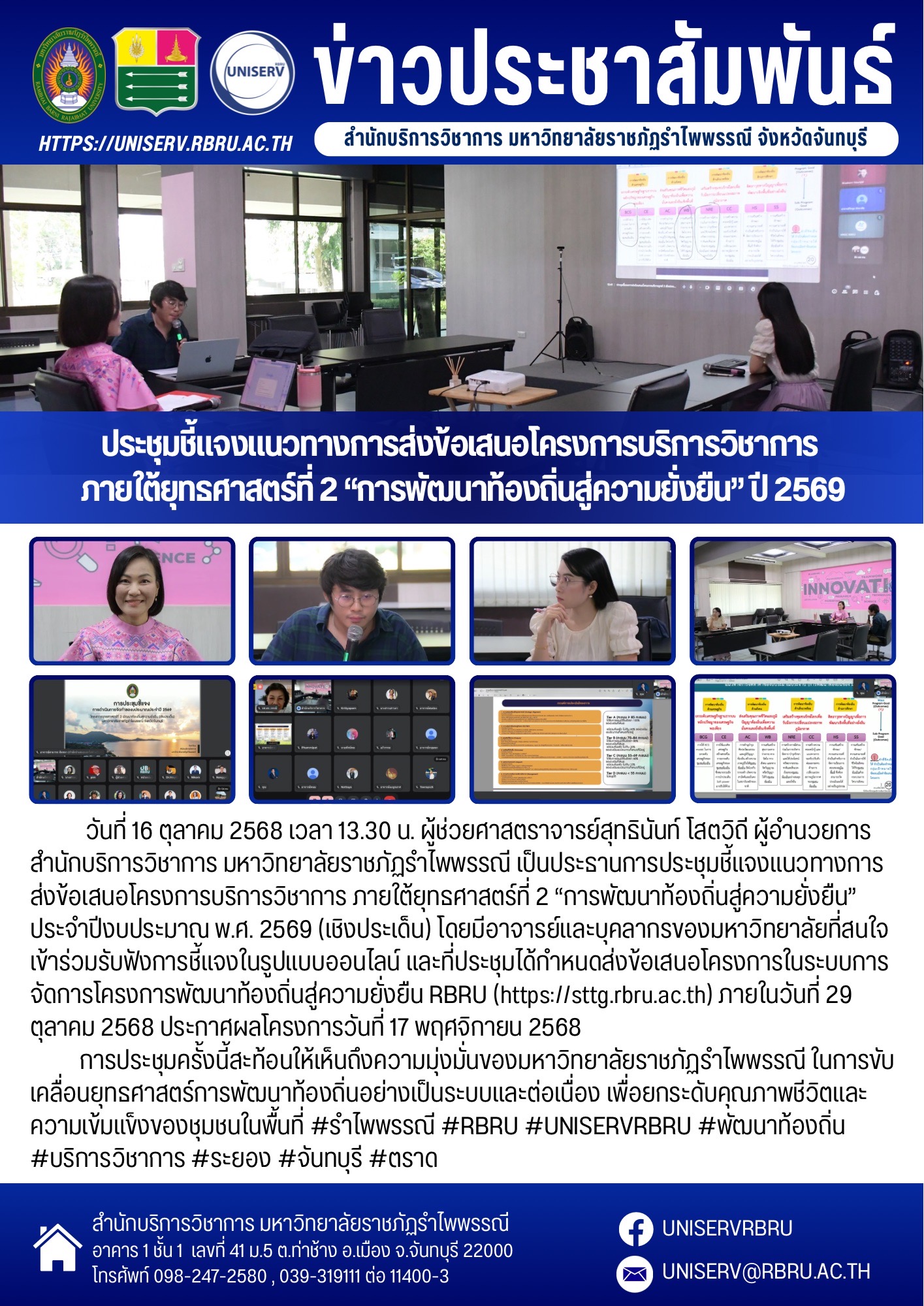 วันที่ 16 ตุลาคม 2568 เวลา 13.30 น. ผู้ช่วยศาสตราจารย์สุทธินันท์ โสตวิถี ผู้อำนวยการสำนักบริการวิชาการ มหาวิทยาลัยราชภัฏรำไพพรรณี เป็นประธานการประชุมชี้แจงแนวทางการส่งข้อเสนอโครงการบริการวิชาการ ภายใต้ยุทธศาสตร์ที่ 2 “การพัฒนาท้องถิ่นสู่ความยั่งยืน” ประจำปีงบประมาณ พ.ศ. 2569 (เชิงประเด็น) โดยมีอาจารย์และบุคลากรของมหาวิทยาลัยที่สนใจ เข้าร่วมรับฟังการชี้แจงในรูปแบบออนไลน์ และที่ประชุมได้กำหนดส่งข้อเสนอโครงการในระบบการจัดการโครงการพัฒนาท้องถิ่นสู่ความยั่งยืน RBRU (https://sttg.rbru.ac.th) ภายในวันที่ 29 ตุลาคม 2568 ประกาศผลโครงการวันที่ 17 พฤศจิกายน 2568