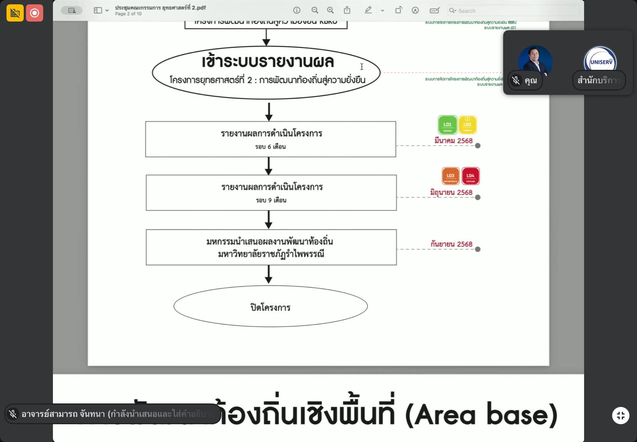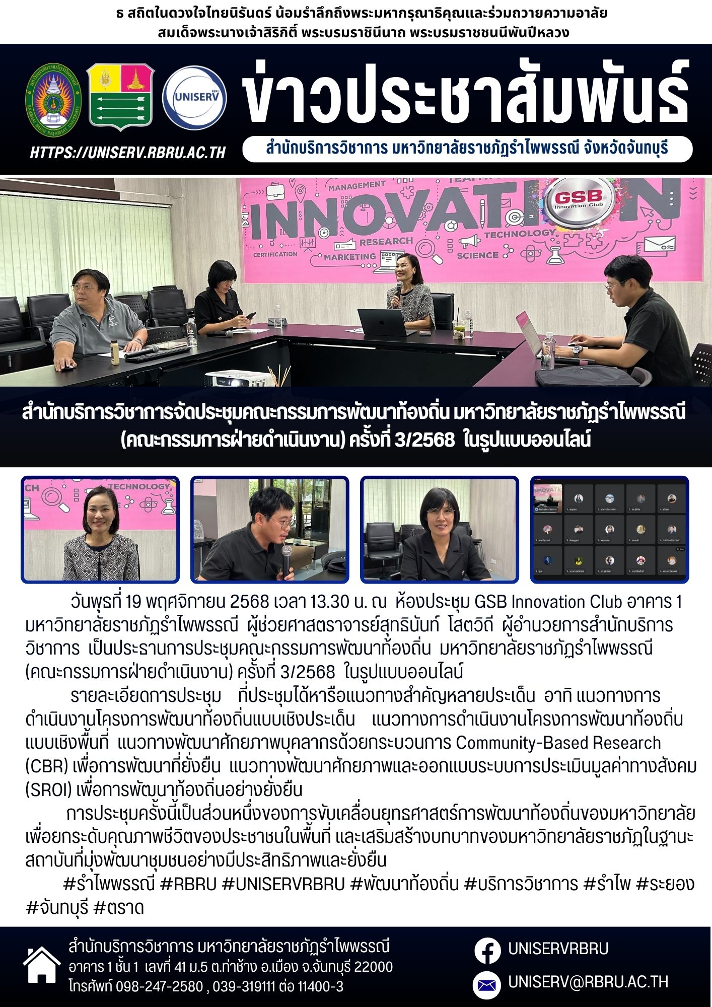 วันที่ 19 พฤศจิกายน 2568 เวลา 13.30 น. ณ ห้องประชุม GSB Innovation Club อาคาร 1 มหาวิทยาลัยราชภัฏรำไพพรรณี ผู้ช่วยศาสตราจารย์สุทธินันท์ โสตวิถี ผู้อำนวยการสำนักบริการวิชาการ เป็นประธานการประชุมคณะกรรมการพัฒนาท้องถิ่น มหาวิทยาลัยราชภัฏรำไพพรรณี (คณะกรรมการฝ่ายดำเนินงาน) ครั้งที่ 3/2568 ในรูปแบบออนไลน์ รายละเอียดการประชุม ที่ประชุมได้หารือแนวทางสำคัญหลายประเด็น อาทิ แนวทางการดำเนินงานโครงการพัฒนาท้องถิ่นแบบเชิงประเด็น แนวทางการดำเนินงานโครงการพัฒนาท้องถิ่นแบบเชิงพื้นที่ แนวทางพัฒนาศักยภาพบุคลากรด้วยกระบวนการ Community-Based Research (CBR) เพื่อการพัฒนาที่ยั่งยืน แนวทางพัฒนาศักยภาพและออกแบบระบบการประเมินมูลค่าทางสังคม (SROI) เพื่อการพัฒนาท้องถิ่นอย่างยั่งยืน