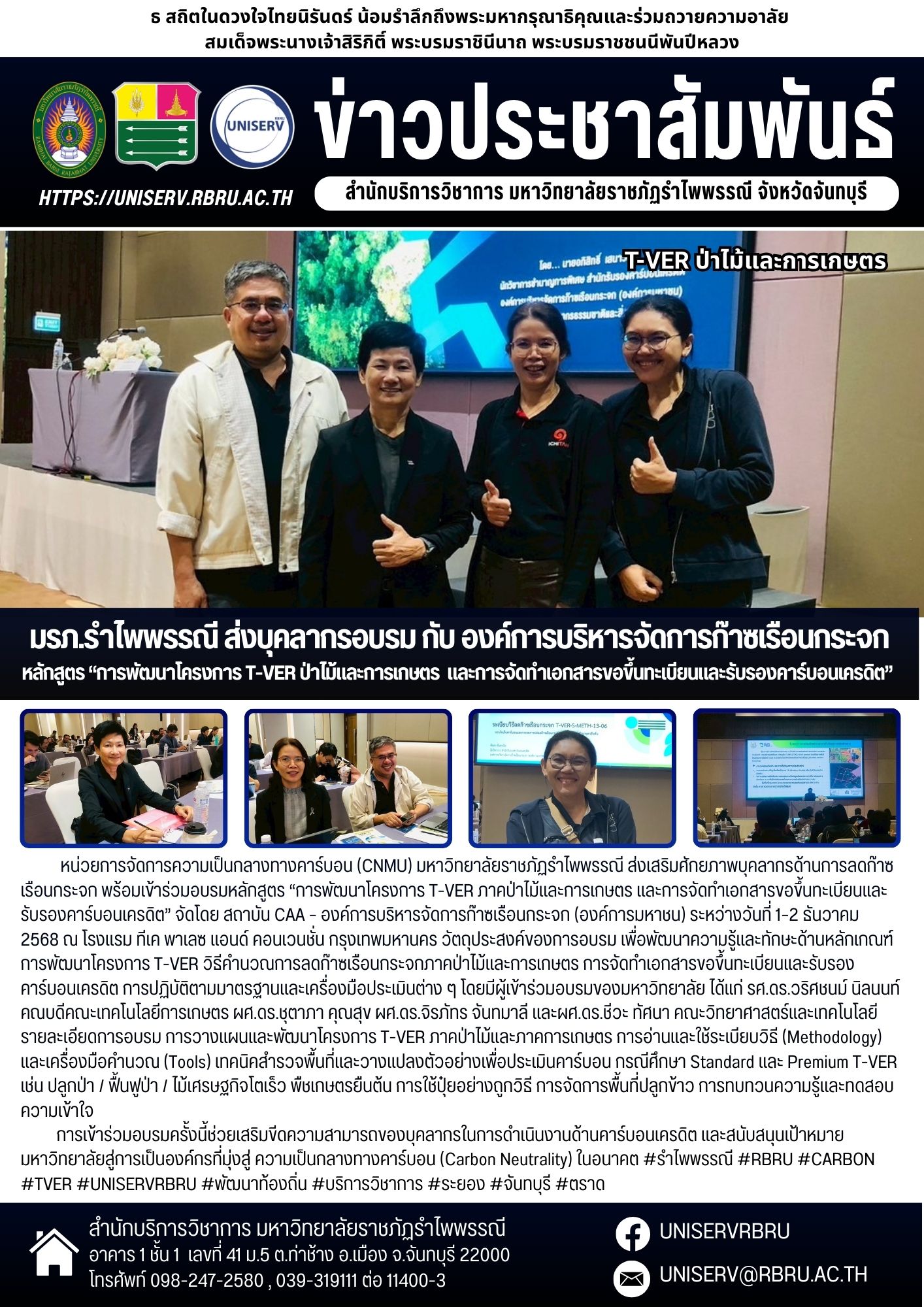 หน่วยการจัดการความเป็นกลางทางคาร์บอน (CNMU) มหาวิทยาลัยราชภัฏรำไพพรรณี ส่งเสริมศักยภาพบุคลากรด้านการลดก๊าซเรือนกระจก พร้อมเข้าร่วมอบรมหลักสูตร “การพัฒนาโครงการ T-VER ภาคป่าไม้และการเกษตร และการจัดทำเอกสารขอขึ้นทะเบียนและรับรองคาร์บอนเครดิต” จัดโดย สถาบัน CAA – องค์การบริหารจัดการก๊าซเรือนกระจก (องค์การมหาชน) ระหว่างวันที่ 1–2 ธันวาคม 2568 ณ โรงแรม ทีเค พาเลซ แอนด์ คอนเวนชั่น กรุงเทพมหานคร วัตถุประสงค์ของการอบรม เพื่อพัฒนาความรู้และทักษะด้านหลักเกณฑ์การพัฒนาโครงการ T-VER วิธีคำนวณการลดก๊าซเรือนกระจกภาคป่าไม้และการเกษตร การจัดทำเอกสารขอขึ้นทะเบียนและรับรองคาร์บอนเครดิต การปฏิบัติตามมาตรฐานและเครื่องมือประเมินต่าง ๆ โดยมีผู้เข้าร่วมอบรมของมหาวิทยาลัย ได้แก่ รศ.ดร.วริศชนม์ นิลนนท์ คณบดีคณะเทคโนโลยีการเกษตร ผศ.ดร.ชุตาภา คุณสุข ผศ.ดร.จิรภัทร จันทมาลี และผศ.ดร.ชีวะ ทัศนา คณะวิทยาศาสตร์และเทคโนโลยี รายละเอียดการอบรม การวางแผนและพัฒนาโครงการ T-VER ภาคป่าไม้และภาคการเกษตร การอ่านและใช้ระเบียบวิธี (Methodology) และเครื่องมือคำนวณ (Tools) เทคนิคสำรวจพื้นที่และวางแปลงตัวอย่างเพื่อประเมินคาร์บอน กรณีศึกษา Standard และ Premium T-VER เช่น ปลูกป่า / ฟื้นฟูป่า / ไม้เศรษฐกิจโตเร็ว พืชเกษตรยืนต้น การใช้ปุ๋ยอย่างถูกวิธี การจัดการพื้นที่ปลูกข้าว การทบทวนความรู้และทดสอบความเข้าใจ